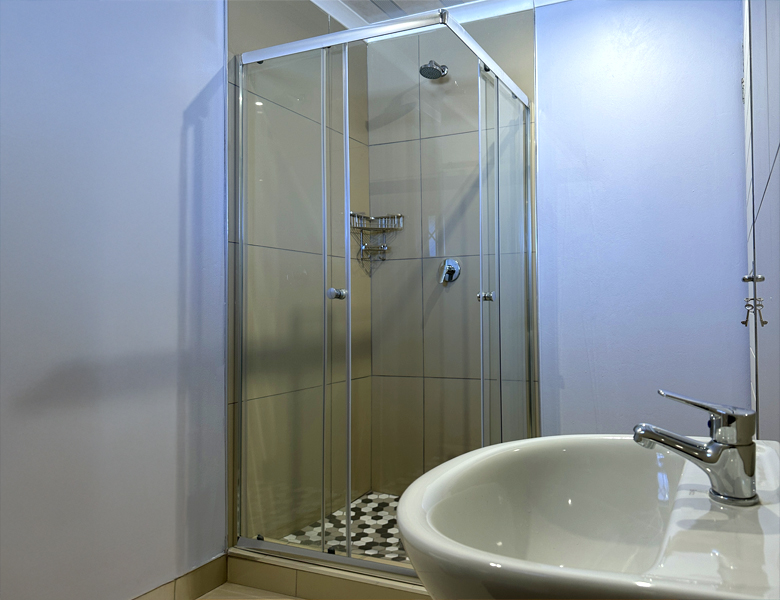 The shower area is fitted with a sleek glass enclosure, complemented by a modern sink that completes the bathroom’s clean and functional design.